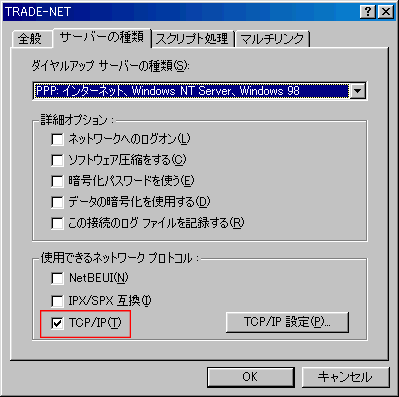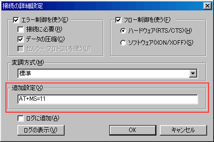 「追加設定」欄に上記の1〜3をそれぞれ入力しダイヤルアップ接続を試してください。