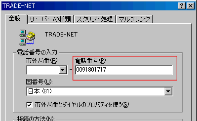 「マイコンピュータ」→「ダイヤルアップネットワーク」を開きます。 「TRADE-NET」のアイコンを右クリックして「プロパティ」を選択します。