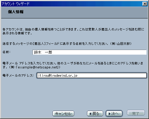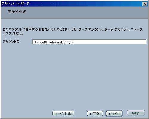 送信サーバ:【サーバ名】に[tradewind.or.jp]のように入力して、[次へ]を