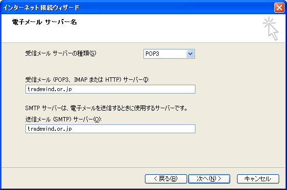 サーバー(I)」は「tradewind.or.jp」、「送信メール(SMTP)サーバー(O)」は「tradewind.or.jp」と入力し、[次へ]をクリックします。