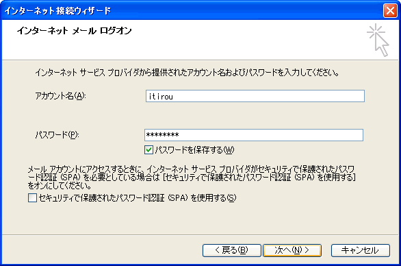パスワード認証(SPA)を使用する]はチェックをしません。[次へ]をクリックします。