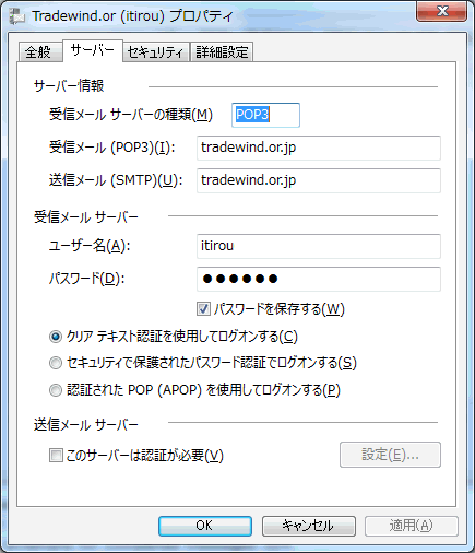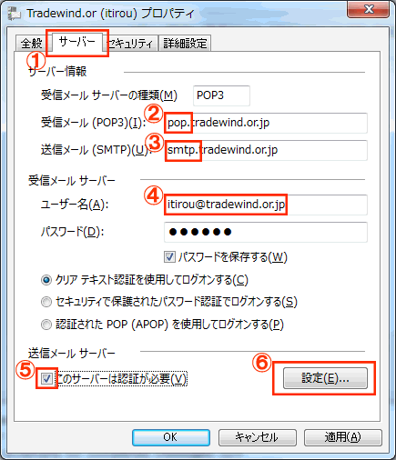 左の画面と照らし合せると違いが分かるかと思います。  @「サーバ」タグをクリックします。  A受信メール(POP3) pop. を追加し    pop.tradewind.or.jp のように設定します。  B送信メール(SMTP) smtp. を追加し    smtp.tradewind.or.jp のように設定します。  Cユーザ名(A)にメールアドレスを入力します。    ユーザ名@tradewind.or.jpと入力します。    パスワードは変更しません。  Dこのサーバーは認証が必要(V) にチェックを入れます。  E設定(E)ボタンをクリックします。