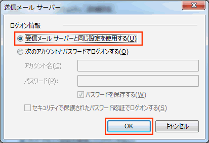 「受信メールサーバーと同じ設定を使用する(U)」を選択し、OKボタンをクリックします。