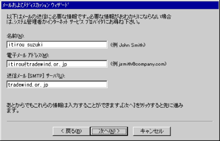 4.[送信メール(SMTP)サーバー]には、「tradewind.or.jp」のように入力して下さい。