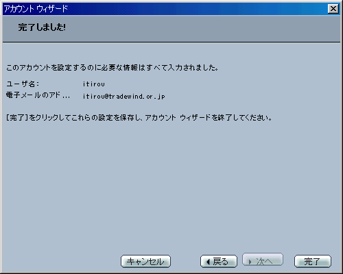 送信サーバ:【サーバ名】に[tradewind.or.jp]のように入力して、[次へ]を