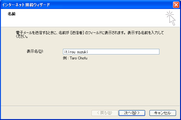 メールが届いたときに相手のメールソフトに表示される名前になります。[次へ]