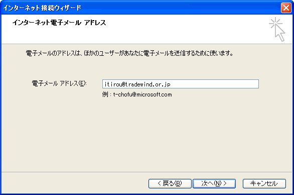 サーバー(I)」は「tradewind.or.jp」、「送信メール(SMTP)サーバー(O)」は「tradewind.or.jp」と入力し、[次へ]をクリックします。